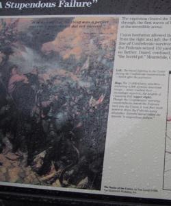 On June 25,1864 Union soldiers of the 48th PA volunteers, mostly coal miners, began digging a 511 ft. tunnel toward a Confederate fort at Pegram’s (or Elliott’s) Salient. It took a month to dig, and the plan was to explode 4 tons of gunpowder under the area, creating a large gap in their defense line, then pouring troops through the hole. On July 30 at 4:45 am the mine was detonated, and it created a crater about 180 ft. long, 60 ft. wide and 25 ft. deep. The Union troops rushed forward into the tunnel, instead of going around it.
